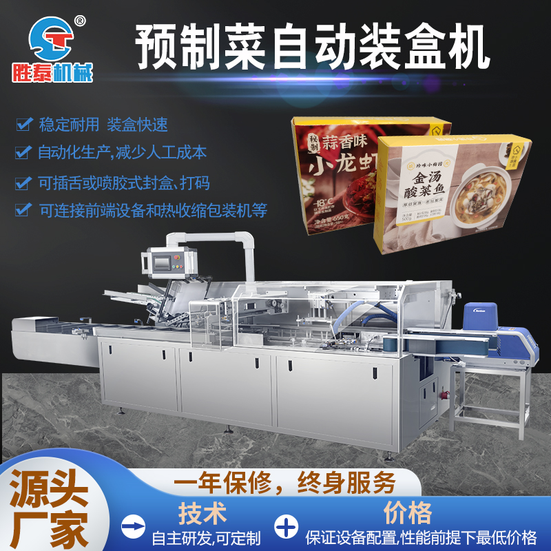 預制菜自動裝盒機主要采用型號STZ-260機器。包裝規格大,范圍廣??砂b小龍蝦、酸菜魚、煲仔飯、外賣快餐、蓋澆飯等熟食。裝盒機采用雙吸盒(上下吸盒)聯動結構,下盒尺寸精準穩定,大大提升下盒故障率。本機采用國內(外)知名品牌電氣元件,標準執行原件等性能穩定可靠。(歐姆龍、思科、施耐德、亞德客等)。具故障顯示,報警和成品計數等功能,目視化方便定期維護和故障排查。自動踢除缺包裝物或缺說明書的包裝成品,確保包裝成品品質??勺詣舆B線前端給袋式包裝機,后端連線熱收縮包裝機、打碼機等,自動化程度高。封口方式可插舌或者噴膠式。